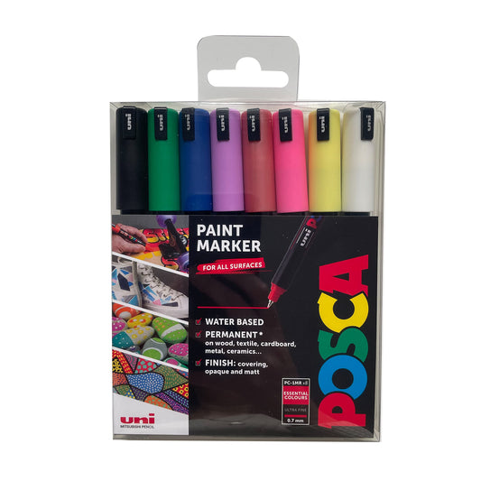 POSCA PC-1M Water Based Permanent Marker Paint Pens. Extra Fine Tip for Art & Crafts. Multi Surface Use On Wood Metal Paper Canvas Cardboard Glass Fabric Ceramic Rock Stone Pebble Porcelain. Set of 8