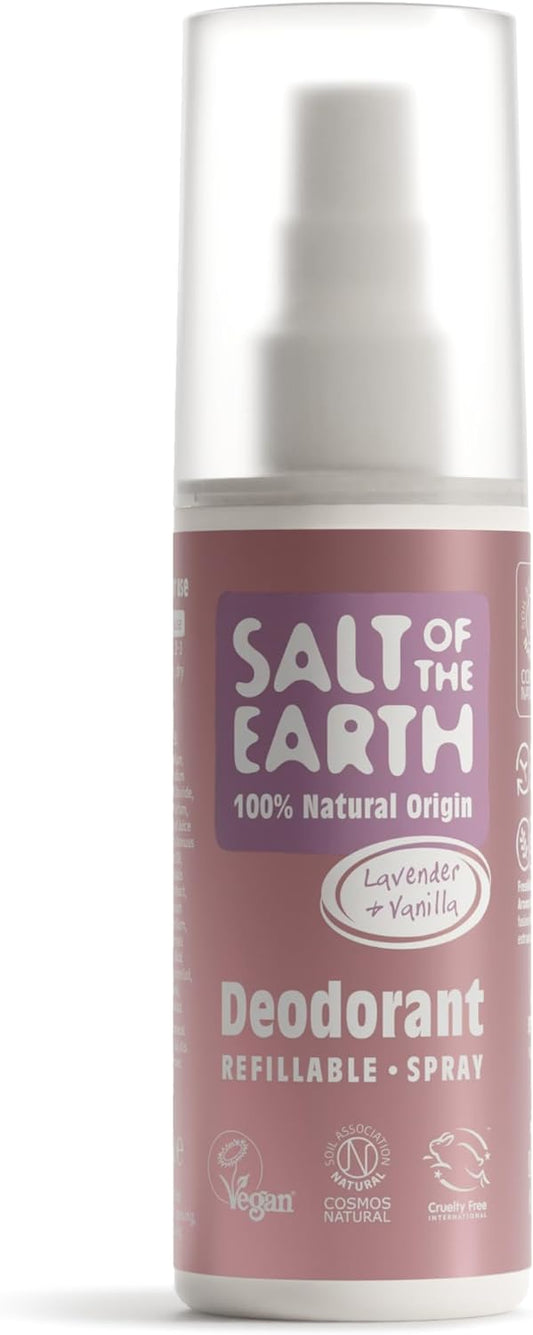 Salt of the Earth – Refillable Natural Deodorant Spray – 100% Natural Origin Ingredients - Vegan, Long Lasting Protection – Suitable For Women, Men & Kids - 100ml (Lavender & Vanilla)